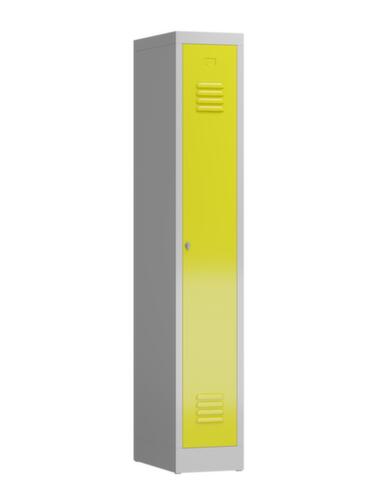 par compartiment 1 tablette à chapeaux et 1 tringle avec 2 doubles crochets. porte battante avec porte-étiquette et fentes d’aération. verrouillable avec serrure porte-cadenas pour cadenas. chaque compartiment à verrouillage individuel. Le socle encastré permet de répartir uniformément le poids de l’armoire sur le sol. Cela augmente la stabilité et l’armoire peut supporter des charges plus lourdes qu’une armoire à pieds. De plus, la saleté, la poussière et l’humidité ne peuvent pas s’infiltrer sous l’armoire, ce qui réduit la surface de nettoyage. structure en acier, soudé. corps avec finition peinture époxy électrostatique en RAL7035 gris clair, face avant avec finition peinture époxy électrostatique en RAL1018 jaune zinc.