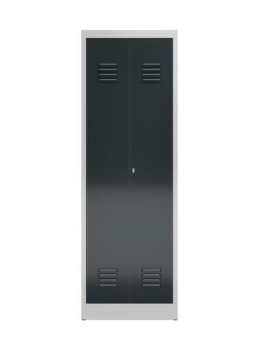 par compartiment 1 tablette à chapeaux et 1 tringle avec 2 doubles crochets. porte à double battant avec fentes d’aération et porte-étiquette. verrouillable avec serrure porte-cadenas pour cadenas. verrouillage commun des portes. Le socle encastré permet de répartir uniformément le poids de l’armoire sur le sol. Cela augmente la stabilité et l’armoire peut supporter des charges plus lourdes qu’une armoire à pieds. De plus, la saleté, la poussière et l’humidité ne peuvent pas s’infiltrer sous l’armoire, ce qui réduit la surface de nettoyage. structure en acier, soudé. corps avec finition peinture époxy électrostatique en RAL7035 gris clair, face avant avec finition peinture époxy électrostatique en RAL7016 gris anthracite.