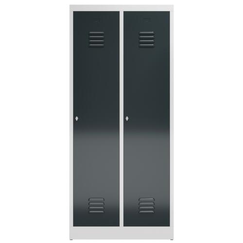 par compartiment 1 tablette à chapeaux et 1 tringle avec 4 doubles crochets. porte battante avec fentes d'aération. verrouillable avec serrure porte-cadenas pour cadenas. chaque compartiment à verrouillage individuel. Le socle encastré permet de répartir uniformément le poids de l’armoire sur le sol. Cela augmente la stabilité et l’armoire peut supporter des charges plus lourdes qu’une armoire à pieds. De plus, la saleté, la poussière et l’humidité ne peuvent pas s’infiltrer sous l’armoire, ce qui réduit la surface de nettoyage. structure en acier, soudé. corps avec finition peinture époxy électrostatique en RAL7035 gris clair, face avant avec finition peinture époxy électrostatique en RAL7016 gris anthracite.