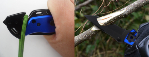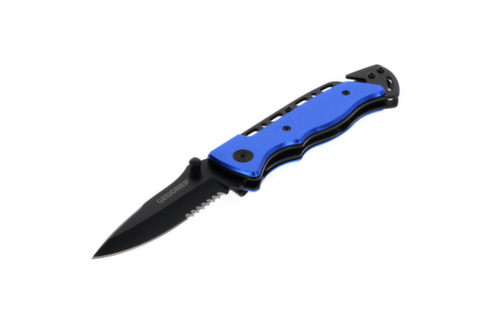 "longDescription": "Pour couper, séparer et découper de nombreux matériaux, Couteau de sauvetage universel de haute qualité avec coupe-ceinture et brise-verre supplémentaires, Aide universelle dans la voiture, le ménage, le jardin et l'atelier, Lame traitée avec denture en scie partielle, Lame noire, Poignées bleues<br>",