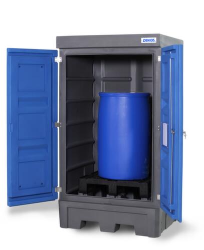 équipé de avec bac de rétention, porte et compartiment dans la porte. soubassement disponibles sous forme de fourreaux de fourche pratiques. Combiné à la hauteur intérieure confortable, cela facilite le transport et le chargement. corps en Polyéthylène gris. Préparé pour une fixation au sol. Produit livré livré monté.