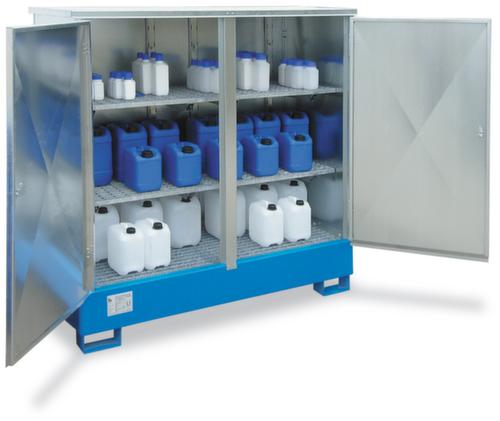 "metaDescription": "Armoire pour produits dangereux, hauteur x largeur x profondeur 1720 x 1760 x 750 mm - p. substances dang. p. l'eau, HxlxP 1720x1760x750mm, porte à battants, 3xcaillebotis, galvanisé, galvanisé",
