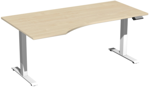 Les principales dimensions du Gera bureau Elevate Plus en un coup d'œil :panneau en bois avec revêtement mélaminé, facile d’entretien finition érable. forme de panneau Forme libre et par là même particulièrement ergonomique, puisque la convexité permet de se rapprocher davantage du panneau de table pendant le travail. creux à gauche. bord avec bande de chant ABS résistante aux chocs qui offre une protection contre les fissures et les éclatements disgracieux. piètement en T en acier avec finition époxy résistante aux chocs et aux rayures en blanc. Forme du tube tube carré. réglage en hauteur via moteur électrique avec transmission manuelle. fonctions : mémorisation et rappel automatique de trois hauteurs de table programmées grâce à la fonction mémoire. La protection anti-collision automatique s'arrête immédiatement en cas de résistance du haut ou du bas et garantit ainsi une protection absolue. châssis avec vis de mise à niveau. port USB-C pour la recharge de périphériques mobiles. Les pieds sont reliés sous le panneau par une traverse. Ces derniers renforcent ainsi la stabilité globale de la table et empêchent la déformation du panneau.