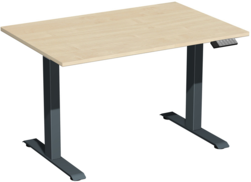 Les principales dimensions du Gera bureau Elevate Basic en un coup d'œil :panneau en bois avec revêtement mélaminé, facile d’entretien finition érable. forme de panneau angulaire. bord avec bande de chant ABS résistante aux chocs qui offre une protection contre les fissures et les éclatements disgracieux. piètement en T en acier avec finition époxy résistante aux chocs et aux rayures en anthracite. Forme du tube tube carré. réglage en hauteur via moteur électrique avec transmission manuelle. fonctions : mémorisation et rappel automatique de trois hauteurs de table programmées grâce à la fonction mémoire. La protection anti-collision automatique s'arrête immédiatement en cas de résistance du haut ou du bas et garantit ainsi une protection absolue. châssis avec vis de mise à niveau. port USB-C pour la recharge de périphériques mobiles. Les pieds sont reliés sous le panneau par une traverse. Ces derniers renforcent ainsi la stabilité globale de la table et empêchent la déformation du panneau.