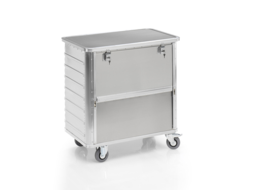 parois avec nervures sur le pourtour. couvercle à charnières. verrouillable avec serrure à cylindre. structure en aluminium. 2 roulettes pivotantes et 2 roulettes fixes. Ø de roue 125 mm. avec bandage caoutchouc plein. moyeu avec roulement à rouleaux. roulettes avec pare-fils, roulettes pivotantes à freins. disposition des roues rectangulaire.