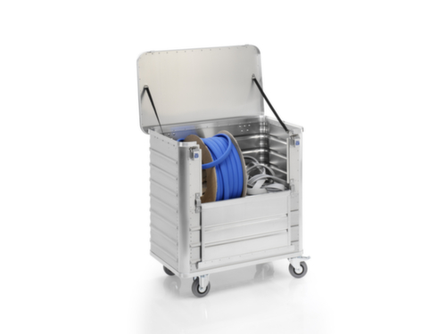 parois avec nervures sur le pourtour. couvercle à charnières. structure en aluminium. 2 roulettes pivotantes et 2 roulettes fixes. Ø de roue 125 mm. avec bandage caoutchouc plein. moyeu avec roulement à rouleaux. roulettes avec pare-fils, roulettes pivotantes à freins. disposition des roues rectangulaire.