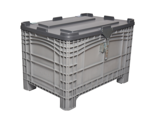 dimensions adaptées aux palettes européennes. en polyéthylène résistant aux chocs en gris. La marchandise se stocke à l’abri de la poussière grâce aux parois fermées et le récipient se nettoie facilement, avec nervures de renfort. Le fond est fermé pour faciliter le nettoyage. Fermeture avec protection contre la poussière via couvercle à charnière. 4 pieds garantissent un support stable.