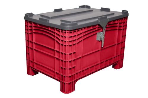 dimensions adaptées aux palettes européennes. en polyéthylène résistant aux chocs en rouge. La marchandise se stocke à l’abri de la poussière grâce aux parois fermées et le récipient se nettoie facilement, avec nervures de renfort. Le fond est fermé pour faciliter le nettoyage. Fermeture avec protection contre la poussière via couvercle à charnière. 4 pieds garantissent un support stable.