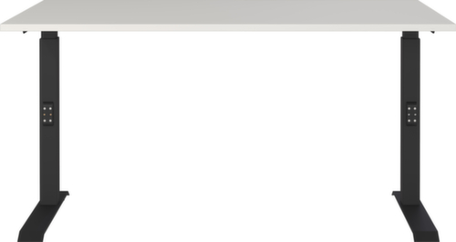 panneau en aggloméré avec revêtement mélaminé, facile d’entretien finition gris clair. forme de panneau angulaire. bord Une bande de chant ABS résistant aux chocs protège tous les bords de fissures et d'éclatements inesthétiques. piètement en C en métal avec finition époxy résistante aux chocs et aux rayures en noir. réglage en hauteur via mécanisme. châssis avec patins en plastique.