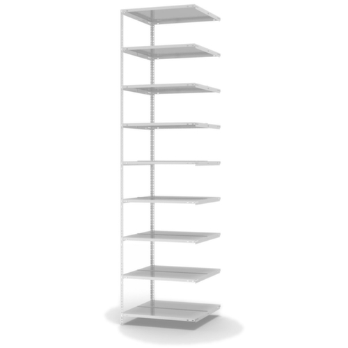 pour votre sécurité : selon DIN EN 15635, il est impératif de sécuriser et de fixer au sol les rayonnages à tablettes dont la hauteur correspond au moins à quatre fois la profondeur du rayonnage (rapport 4:1). les charges max. par tablette indiquées s’entendent pour une répartition uniforme de la charge. des tablettes/niveaux supplémentaires sont disponibles jusqu’à la charge max. par élément.