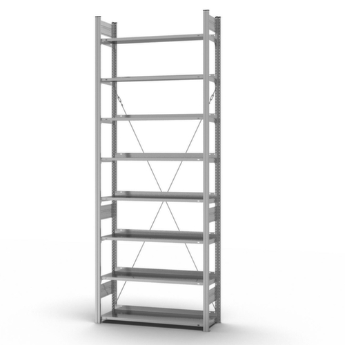 les principales dimensions du hofe du hofe rayonnage sans boulons en un coup d’œil :Vous pourrez organiser au mieux vos dossiers, classeurs et autres outils de bureau sur 8 niveau(x) avec tablettes en tôle d’acier / 8 hauteurs de classeur. niveaux avec rebord antichute et rebord de tablette latéral du niveau supérieur pour éviter les chutes de classeurs. hauteurs de compartiments réglables par pas de 25 mm selon l’usage prévu et vos besoins. utilisation unilatéral - conçu pour un montage mural. Stabilité élevée grâce aux croisillons. structure en acier. montants avec revêtement en zinc anti-corrosion. niveaux avec revêtement en zinc anti-corrosion.