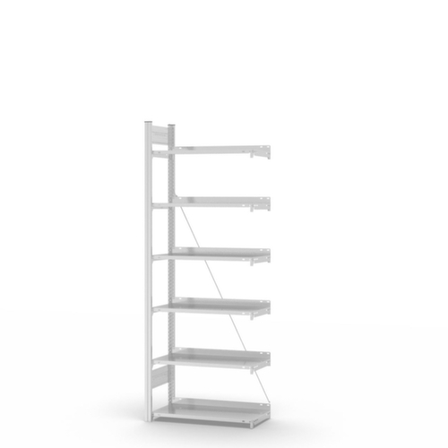 pour votre sécurité : selon DIN EN 15635, il est impératif de sécuriser et de fixer au sol les rayonnages à tablettes dont la hauteur correspond au moins à quatre fois la profondeur du rayonnage (rapport 4:1). les charges max. par tablette indiquées s’entendent pour une répartition uniforme de la charge. des tablettes/niveaux supplémentaires sont disponibles jusqu’à la charge max. par élément.