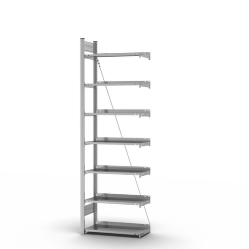pour votre sécurité : selon DIN EN 15635, il est impératif de sécuriser et de fixer au sol les rayonnages à tablettes dont la hauteur correspond au moins à quatre fois la profondeur du rayonnage (rapport 4:1). les charges max. par tablette indiquées s’entendent pour une répartition uniforme de la charge. des tablettes/niveaux supplémentaires sont disponibles jusqu’à la charge max. par élément.