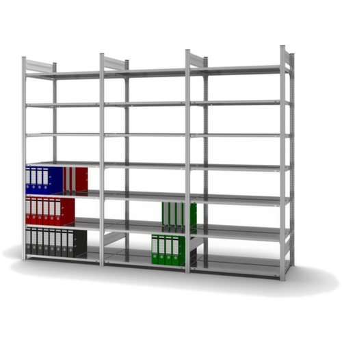 les principales dimensions du hofe du hofe rayonnage sans boulons en un coup d’œil :Vous pourrez organiser au mieux vos dossiers, classeurs et autres outils de bureau sur 7 niveau(x) avec tablettes en tôle d’acier / 7 hauteurs de classeur. niveaux avec rebord antichute central emboîtable et rebord de tablette latéral du niveau supérieur pour éviter les chutes de classeurs. hauteurs de compartiments réglables par pas de 25 mm selon l’usage prévu et vos besoins. utilisation bilatéral - possibilité d’installation flexible librement dans la pièce. Stabilité élevée grâce aux traverses de raidissement. structure en acier. montants avec revêtement en zinc anti-corrosion. niveaux avec revêtement en zinc anti-corrosion.