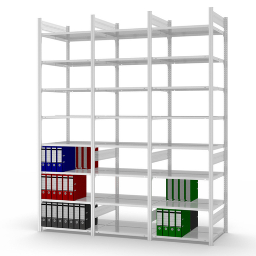 les principales dimensions du hofe du hofe rayonnage sans boulons en un coup d’œil :Vous pourrez organiser au mieux vos dossiers, classeurs et autres outils de bureau sur 8 niveau(x) avec tablettes en tôle d’acier / 8 hauteurs de classeur. niveaux avec rebord antichute central emboîtable et rebord de tablette latéral du niveau supérieur pour éviter les chutes de classeurs. hauteurs de compartiments réglables par pas de 25 mm selon l’usage prévu et vos besoins. utilisation bilatéral - possibilité d’installation flexible librement dans la pièce. Stabilité élevée grâce aux traverses de raidissement. structure en acier. montants galvanisé avec revêtement en plastique en RAL7035 gris clair. niveaux galvanisé avec revêtement en plastique en RAL7035 gris clair.