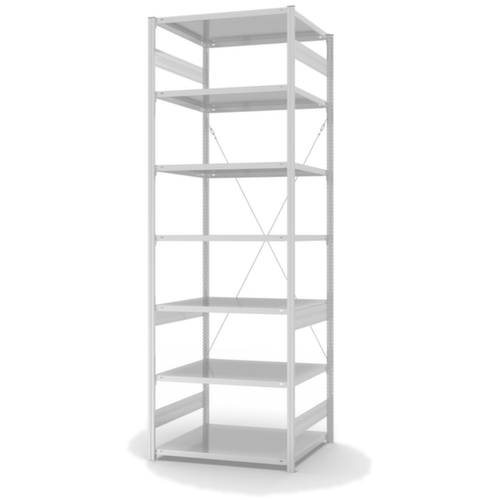 les principales dimensions du hofe rayonnage de stockage AntiBac® en un coup d’œil :7 niveaux avec tablette en acier. hauteurs de compartiments réglables par pas de 25 mm selon l’usage prévu et vos besoins. utilisation unilatéral - conçu pour un montage mural. Stabilité élevée grâce aux croisillons. structure en acier, montants avec revêtement antibactérien contre les staphylocoques dorés, les bacilles pyocyaniques et les bactéries E-Coli en similaire à RAL9016 blanc signalisation, niveaux avec revêtement antibactérien contre les staphylocoques dorés, les bacilles pyocyaniques et les bactéries E-Coli en similaire à RAL9016 blanc signalisation.
