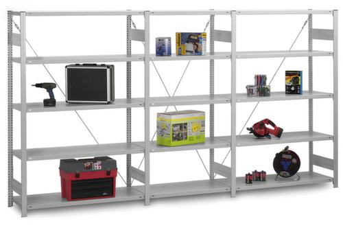 1 rayonnage de base avec 2 échelles et 2 rayonnages suivants avec 1 échelle, croisillons et plateaux conf. à l’offre