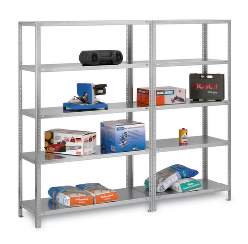 les principales dimensions du hofe rayonnage de stockage en un coup d’œil :5 niveaux avec tablette en acier. 3 pliages de sécurité de 40 mm de hauteur et avec des coins pleins garantissent un degré élevé de stabilité et de protection contre les blessures. hauteurs de compartiments réglables par pas de 25 mm selon l’usage prévu et vos besoins. utilisation unilatéral - conçu pour un montage mural. structure en acier, montants galvanisé avec revêtement en plastique en RAL7035 gris clair, niveaux galvanisé avec revêtement en plastique en RAL7035 gris clair.