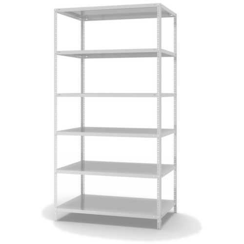les principales dimensions du hofe rayonnage de stockage en un coup d’œil :6 niveaux avec tablette en acier. 3 pliages de sécurité de 40 mm de hauteur et avec des coins pleins garantissent un degré élevé de stabilité et de protection contre les blessures. hauteurs de compartiments réglables par pas de 25 mm selon l’usage prévu et vos besoins. utilisation unilatéral - conçu pour un montage mural. structure en acier, montants galvanisé avec revêtement en plastique en RAL7035 gris clair, niveaux galvanisé avec revêtement en plastique en RAL7035 gris clair.