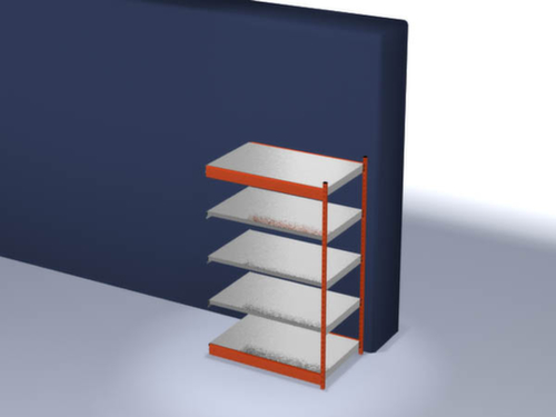 les principales dimensions du hofe rayonnage de stockage en un coup d’œil :5 niveaux avec tablette en acier. niveaux avec pliage de sécurité comme protection contre les blessures. 3 pliages de sécurité de 40 mm de hauteur garantissent un degré élevé de stabilité et de protection contre les blessures. hauteurs de compartiments réglables par pas de 50 mm selon l’usage prévu et vos besoins. angle d'installation droit. utilisation bilatéral - exploitation optimale de l’espace et plus d’espace de rangement, car installation libre dans la pièce. Stabilité élevée grâce aux traverses longitudinales. structure en acier, montants avec revêtement en plastique résistant à l’usure en RAL2004 orangé pur, niveaux avec revêtement en zinc anti-corrosion.