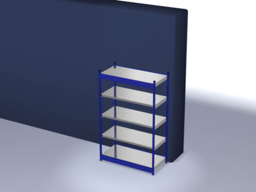les principales dimensions du hofe rayonnage de stockage en un coup d’œil :5 niveaux avec tablette en acier. niveaux avec pliage de sécurité comme protection contre les blessures. 3 pliages de sécurité de 40 mm de hauteur garantissent un degré élevé de stabilité et de protection contre les blessures. hauteurs de compartiments réglables par pas de 50 mm selon l’usage prévu et vos besoins. angle d'installation droit. utilisation bilatéral - possibilité d’installation flexible librement dans la pièce. Stabilité élevée grâce aux traverses longitudinales. structure en acier, montants avec revêtement en plastique résistant à l’usure en RAL5010 bleu gentiane, niveaux avec revêtement en zinc anti-corrosion.