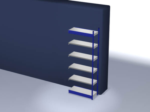 les principales dimensions du hofe rayonnage de stockage en un coup d’œil :6 niveaux avec tablette en acier. niveaux avec pliage de sécurité comme protection contre les blessures. 3 pliages de sécurité de 40 mm de hauteur garantissent un degré élevé de stabilité et de protection contre les blessures. hauteurs de compartiments réglables par pas de 50 mm selon l’usage prévu et vos besoins. angle d'installation droit. utilisation bilatéral - possibilité d’installation flexible librement dans la pièce. Stabilité élevée grâce aux traverses longitudinales. structure en acier, montants avec revêtement en plastique résistant à l’usure en RAL5010 bleu gentiane, niveaux avec revêtement en zinc anti-corrosion.