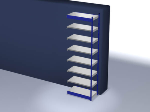 les principales dimensions du hofe rayonnage de stockage en un coup d’œil :7 niveaux avec tablette en acier. niveaux avec pliage de sécurité comme protection contre les blessures. 3 pliages de sécurité de 40 mm de hauteur garantissent un degré élevé de stabilité et de protection contre les blessures. hauteurs de compartiments réglables par pas de 50 mm selon l’usage prévu et vos besoins. angle d'installation droit. utilisation unilatéral - conçu pour un montage mural. Stabilité élevée grâce aux traverses longitudinales. structure en acier, montants avec revêtement en plastique résistant à l’usure en RAL5010 bleu gentiane, niveaux avec revêtement en zinc anti-corrosion.