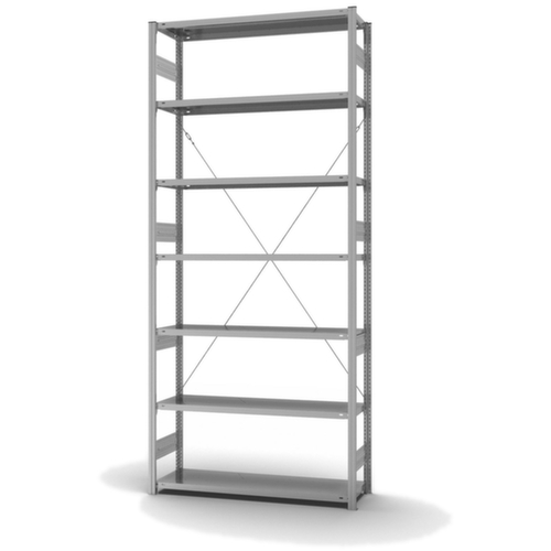 les principales dimensions du hofe rayonnage de stockage en un coup d’œil :7 niveaux avec tablette en acier. niveaux avec pliage de sécurité comme protection contre les blessures. 3 pliages de sécurité de 40 mm de hauteur et avec des coins pleins garantissent un degré élevé de stabilité et de protection contre les blessures. hauteurs de compartiments réglables par pas de 25 mm selon l’usage prévu et vos besoins. angle d'installation droit. utilisation unilatéral - conçu pour un montage mural. Stabilité élevée grâce aux croisillons. Les tôles de liaison en profondeur et les embases en acier confèrent une excellente stabilité au rayonnage. Les caches profilés supérieurs assurent une finition soignée. structure en acier, montants avec revêtement en zinc anti-corrosion, niveaux avec revêtement en zinc anti-corrosion.