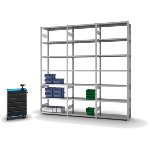 les principales dimensions du hofe rayonnage de stockage en un coup d’œil :7 niveaux avec tablette en acier. hauteurs de compartiments réglables par pas de 25 mm selon l’usage prévu et vos besoins. angle d'installation droit. utilisation bilatéral - possibilité d’installation flexible librement dans la pièce. Stabilité élevée grâce aux croisillons et aux traverses longitudinales. Les tôles de liaison en profondeur et les embases en acier confèrent une excellente stabilité au rayonnage. Les caches profilés supérieurs assurent une finition soignée. structure en acier, montants avec revêtement en zinc anti-corrosion, niveaux avec revêtement en zinc anti-corrosion.