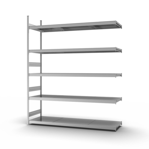 Les principales dimensions du hofe rayonnage grande largeur en un coup d’œil :5 niveaux avec tablette en acier. hauteurs de compartiments réglables par pas de 25 mm selon l’usage prévu et vos besoins. utilisation bilatéral - possibilité d’installation flexible librement dans la pièce. Les tôles de liaison en profondeur et les embases en acier confèrent une excellente stabilité au rayonnage. Les caches profilés supérieurs assurent une finition soignée. structure en acier, montants avec revêtement en zinc anti-corrosion, niveaux avec revêtement en zinc anti-corrosion,