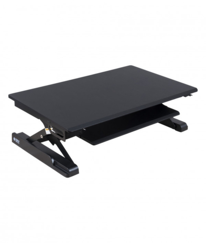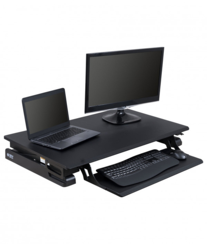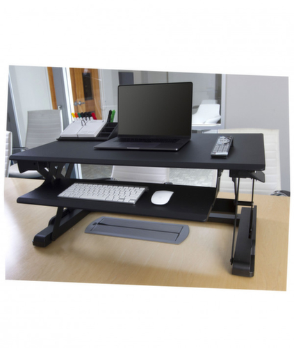 "longDescription": "<h2>Rehausse de bureau à hauteur réglable</h2><strong>transforme chaque table en un poste de travail assis-debout peu onéreux</strong><br><ul><li>Pour un travail plus sain et plus productif</li><li><strong>Ajustement individuel à la taille de l’utilisateur</strong> - hauteur réglable en continu</li><li><strong>Peu encombrant</strong> - ne se déplace de haut en bas que dans son propre encombrement</li></ul><br><h3>Équipement :</h3><ul><li>Le plateau du clavier et de la souris reste toujours en place pendant la frappe et peut être simplement glissé sous la surface de travail en cas de besoin</li></ul><br><h3>Panneau :</h3><ul><li>Offre de l'espace pour deux écrans</li><li><strong>Protège les avant-bras</strong> - grâce à des bords arrondis</li><li>En MDF</li></ul><br><h3>Bâti :</h3><ul><li><strong>Levage et abaissement sans effort</strong> grâce à un mécanisme de ciseaux à ressorts</li><li><strong>Absolument stable</strong> - Cadre en acier avec butées en caoutchouc</li></ul>",