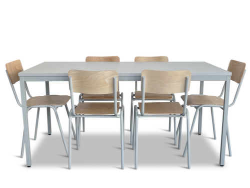 caractéristiques :assise en multiplis de hêtre en nature. dossier en multiplis de hêtre en nature. chaises avec piètement 4 pieds en acier avec laquage en gris clair. table avec piètement 4 pieds en acier avec laquage en gris. panneau en aggloméré avec revêtement mélaminé, facile d’entretien finition gris. châssis avec patins protecteurs. table hauteur x largeur x profondeur 740 x 1600 x 800 mm. Possibilité d'empiler plusieurs chaises pour un gain de place gerbable.