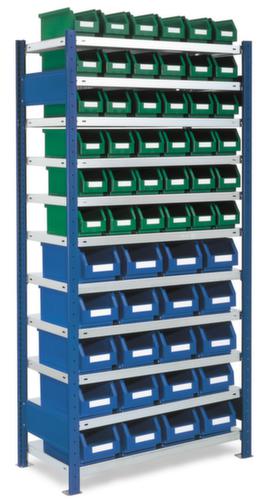 Les principales dimensions du Kappes rayonnage à bacs RasterPlan® en un coup d’œil :Stockage clairement organisé des petites pièces sur 11 plateaux avec tablette en acier et 56 bacs. hauteurs de compartiments réglables par pas de 25 mm selon l’usage prévu et vos besoins. utilisation unilatéral - conçu pour un montage mural. structure en acier. montants avec revêtement en plastique résistant à l’usure en bleu gentiane. niveaux avec revêtement en zinc anti-corrosion.