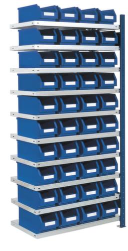 Les principales dimensions du Kappes rayonnage à bacs en un coup d’œil :Stockage clairement organisé des petites pièces sur 10 plateaux avec tablette en acier et 40 bacs. niveau(x) avec pliage de sécurité comme protection contre les blessures. utilisation unilatéral - conçu pour un montage mural. structure en acier. montants avec finition époxy résistante aux chocs et aux rayures en RAL5010 bleu gentiane.