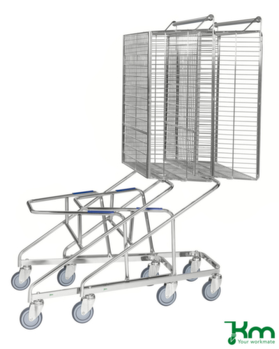 plateau(x) en acier à galvanisation électrolytique. châssis à galvanisation électrolytique. structure en acier. montage barre de poussée et panier en fil, 390 mm haut. Lorsqu'il n'est pas utilisé, le panier peut être relevé. empilable pour gain de place. Manœuvre et déplacement aisés grâce à 4 roulettes pivotantes. Ø de roue 125 mm. disposition des roues trapézoïdal.
