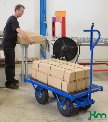 plateforme en contreplaqué. timon avec œillet de suspension. structure en acier, à soudure fixe. Cela confère à la structure la robustesse et la stabilité nécessaires pour être à la hauteur d'une multitude de cas d'utilisation. châssis avec finition époxy résistante aux chocs et aux rayures en bleu. 4 roulettes fixes. Ø de roue 300 mm. roues avec bandage air préservant le sol et silencieux sur jante acier. moyeu avec roulement à rouleaux. freinage par le timon, agit sur les roues avant. disposition des roues parallèle.