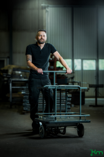 "metaDescription": "Kongamek Chariot à roulettes avec garde-fou sur la zone de chargement, plateau 697 x 597 mm - 1plateforme, klaxon, plateau, plateau Lxl 697x597mm, 3roues, bandage caoutchouc plein",