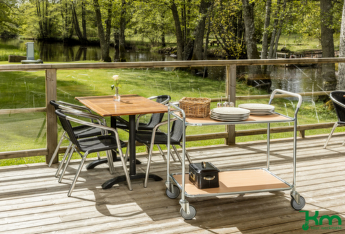 plateau(x) avec revêtement mélaminé résistant à l'abrasion et à l'humidité coloris hêtre. plateau(x) avec rebord antichute. barre de poussée vertical, avec gaine plastique. châssis à galvanisation électrolytique. structure en acier. Manœuvre et déplacement aisés grâce à 4 roulettes pivotantes. Ø de roue 125 mm. roues avec bandage TPE préservant le sol sur jante polypropylène robuste et incassable. moyeu avec roulement à billes de précision. boîtier en acier. disposition des roues parallèle.