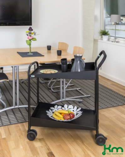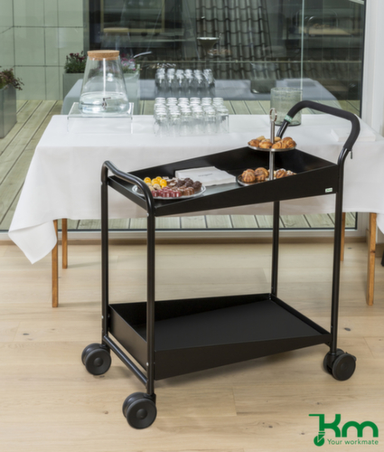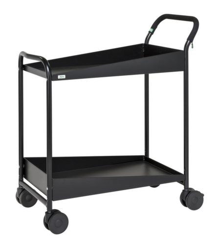 plateau(x) en acier avec revêtement en caoutchouc en noir. plateau(x) avec rebord longitudinal. hauteur du bord 31 mm. avec 2 tablettes. barre de poussée vertical. châssis avec finition époxy résistante aux chocs et aux rayures en noir. structure en acier. Manœuvre et déplacement aisés grâce à 4 roulettes pivotantes, 2 roulettes avec freins. Ø de roue 100 mm. avec bandage TPE préservant le sol. moyeu avec roulement à billes adapté pour un usage en continu. disposition des roues rectangulaire.