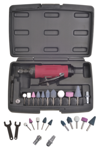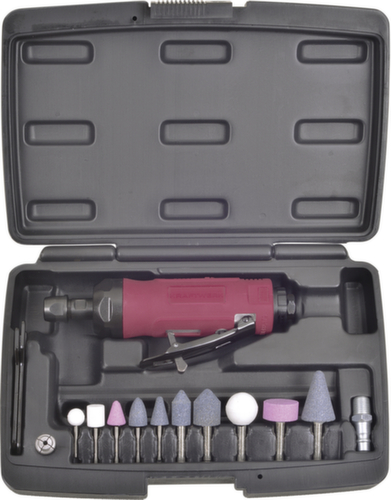 "longDescription": "Set de mini ponceuses pneumatiques, 15 pièces <br>- Pour poncer, polir et ébavurer<br>- Incl. de différentes pierres abrasives, de deux pinces de serrage et d'un outil de montage<br>- Design droit et compact<br>- Pour le travail dans les zones difficiles<br>- Utilisation à une main<br>- Réglage de la vitesse en continu<br>- Poignée ergonomique isolée du froid <br>- Mandrin de serrage : 3 ou 6 mm<br>- Niveau de puissance sonore : 80 dBA<br>- Pression de travail recommandée : 6,3 bar (90 PSI)<br>- Diamètre de tuyau recommandé : 3/8\" (10 mm)<br>- Longueur totale : 155 mm<br>- Poids : 0,4 kg<br><br>",