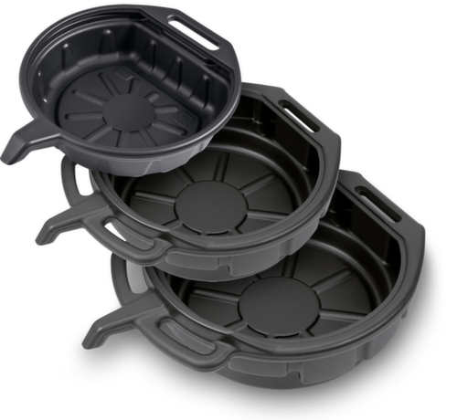 "longDescription": "Set de bacs de récupération d'huile, 3 pièces<br>- Avec bec verseur<br>- Résistant à la plupart des solvants (T < 60 °C), acides, bases, alcool, huile, essence<br>- Fabriqué en HDPE<br>- Résistant aux chocs<br><br>",