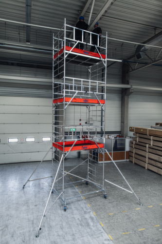 Les échelons profilés antidérapants permettent de grimper en toute sécurité en intérieur. mezzanine modulaire avec revêtement antidérapant et résistant aux intempéries. application sûre grâce à système GuardMatic. Fixer le cadre de la rambarde GuardMatic avant d’accrocher la mezzanine modulaire suivante permet de garantir un montage sûr. En outre, ce système permet de disposer d’une rambarde complète et d’un dispositif antichute lors du passage. 4 potences assurent davantage de stabilité. avec 4 roulettes autobloquantes et réglables en hauteur pour compenser les inégalités du sol. échafaudage en aluminium. Force max. 200 kg/m².