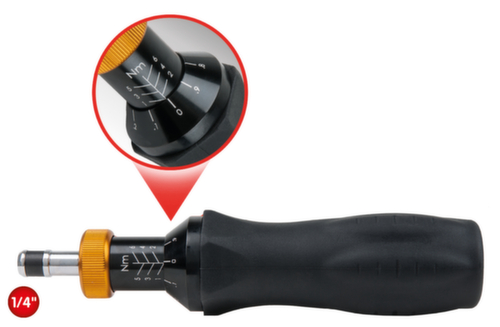 "longDescription": "<ul><li class=\"liste\">précision du déclenchement : tolérance de <span class=\"ROT\">±6 %</span> de la valeur d'échelle réglée et mieux</li><li class=\"liste\">répétitif et précis pour au moins 5.000 cycles de charge</li><li class=\"liste\">pour un serrage contrôlé à droite et à gauche</li><li class=\"liste\">avec ressort de compression à vis de précision</li><li class=\"liste\">déclenchement du couple clairement perceptible par surcliquetage</li><li class=\"liste\">un dépassement de la valeur réglée est impossible</li><li class=\"liste\">retour automatique à la position initiale</li><li class=\"liste\">échelle micrométrique Nm divisible incluse pour un réglage fin et précis</li><li class=\"liste\">forme ergonomique de la poignée en caoutchouc pour une transmission sûre du couple de serrage</li><li class=\"liste\">prise à six pans creux selon DIN 3126 - E 6,3</li><li class=\"liste\">numéro de série individuel pour une identification claire du produit</li><li class=\"liste\">y compris déclaration de conformité de l'étalonnage selon DIN EN ISO 6789:2017(E) - traçable aux normes nationales</li></ul><br>",