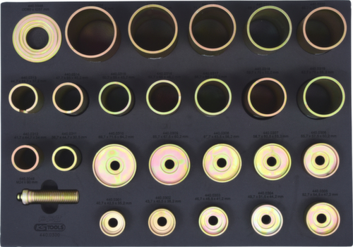 "longDescription": "pour le montage et le démontage de roulements, bagues et joints de support, l'adaptateur et l'arbre de pression permettent l'utilisation avec le support de presse universel (440.0180), 24 douilles de presse de différentes tailles, 61 diamètres intérieurs et extérieurs différents entre 30,5 mm et 79,7 mm, application universelle pour les voitures et les fourgonnettes, utilisation excellente également avec la presse d'atelier, acier à outils spécial<br>",