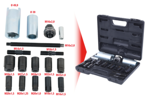 "longDescription": "Idéalement adapté pour le tirage de l'arbre d'entraînement dans le moyeu de roue, outil de tirage avec broche trempée, comprenant 10 douilles de tirage avec différents filetages, conception robuste, manipulation facile, acier à outils spécial, dans un boîtier plastique robuste,,,,Domaines d'application :, ,BMW,, ,Mercedes, ,Porsche,, ,Volkswagen, ,Audi, etc. ,<br>",