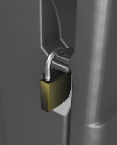 Caractéristiques :porte à battants avec poignée. 2 roues avec bandage caoutchouc plein. verrouillable avec cadenas. équipé de dispositif de maintien pour support d’avertissement.