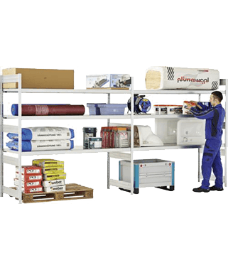 Les rayonnages grande largeur sont particulièrement adaptés aux marchandises lourdes ou volumineuses. Ce type de rayonnage, qui peut être divisé entre rayonnage à tablettes/étagères et rayonnage à palettes, est particulièrement convaincant en raison de sa très grande flexibilité. Grâce à la construction simple à enficher, les rayonnages grande largeur peuvent être rapidement assemblés et adaptés aux conditions requises. Les étagères sont accessibles d'un seul côté ou des deux côtés.