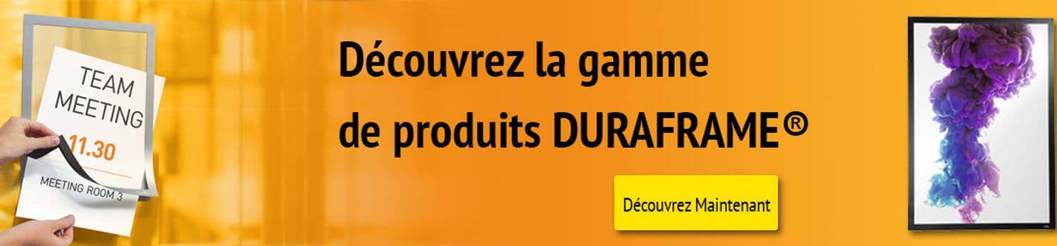 Choisissez le cadre qui vous convient le mieux dans un large assortiment de formats, de couleurs et de fermetures. DURABLE offre une gamme complète avec la gamme de produits DURAFRAME. Ne cherchez pas ailleurs, trouvez-le ici.