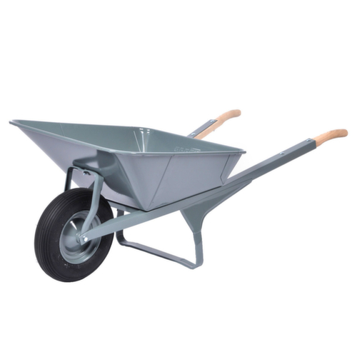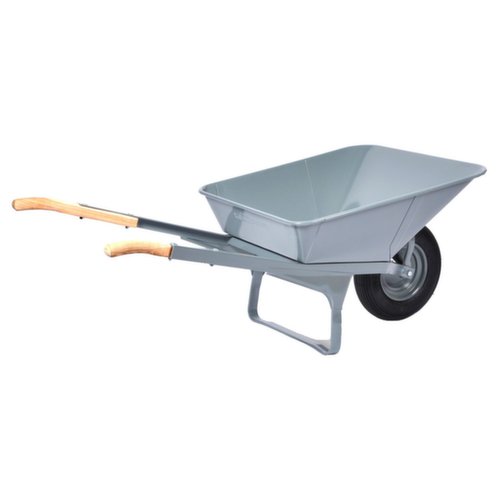 rehausses : Benne. Benne en acier coloris gris. structure en acier. châssis laqué et avec finition peinture époxy anti-chocs et anti-rayures en gris. L'insert annulaire en acier massif améliore la stabilité de la benne. roue avec bandage air préservant le sol et silencieux sur jante acier. moyeu avec roulement à billes étanchéifié des deux côtés. Cette structure empêche la pénétration de particules de saleté dans le roulement.