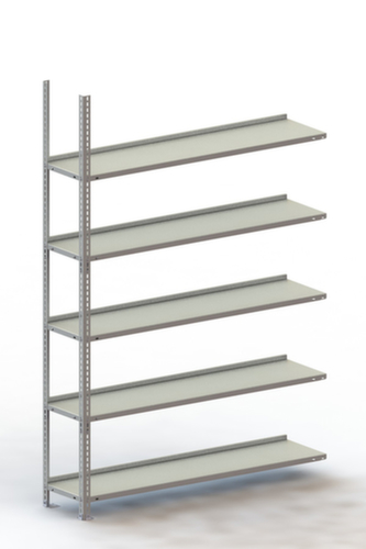 les principales dimensions du META rayonnage pour classeurs en un coup d’œil :Vous pourrez organiser au mieux vos dossiers, classeurs et autres outils de bureau sur 5 niveau(x) avec tablettes en tôle d’acier de qualité / 5 hauteurs de classeur. hauteurs de compartiments réglables par pas de 25 mm selon l’usage prévu et vos besoins. niveaux avec rebord antichute arrière contre la chute de classeurs. les canaux longitudinaux en forme de M à 5 pliages garantissent un degré élevé de stabilité et de protection contre les blessures. utilisation unilatéral - conçu pour un montage mural. structure en acier, montants galvanisé avec finition peinture époxy antichocs et antirayures en RAL7035 gris clair, niveaux galvanisé avec finition peinture époxy antichocs et antirayures en RAL7035 gris clair.